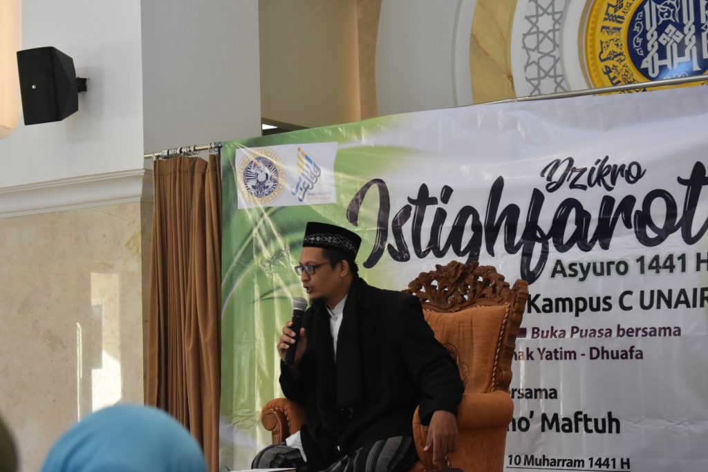 UNAIR NEWS – Memasuki bulan Muharram 1441 H, terdapat satu hari dimana umat muslim dianjurkan untuk berpuasa yakni hari Asyuro. Bertepatan dengan hari tersebut, mahasiswa Masjid Ulul Azmi Universitas Airlangga (UNAIR) menggelar acara Dzikro Istighfarot dan buka bersama anak yatim pada Selasa (10/09/2019) di Aula Utama Masjid Ulul Azmi, Kampus C UNAIR.