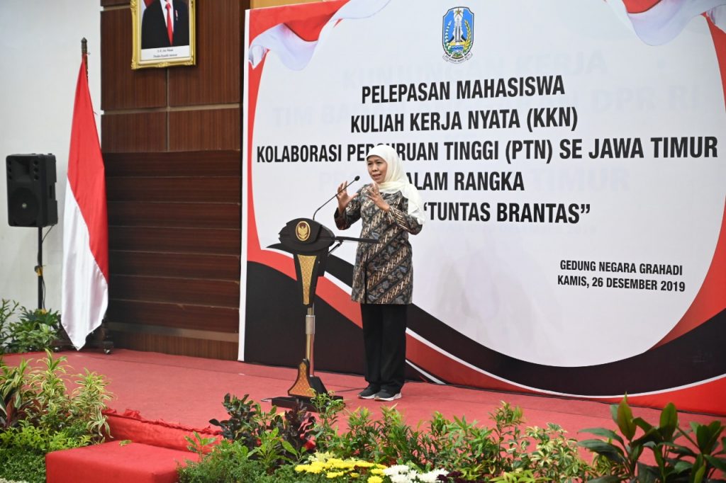 UNAIR NEWS – Gubernur Jawa Timur Dra. Hj. Khofifah Indar Parawansa, M.Si secara resmi melepas mahasiswa Kuliah Kerja Nyata (KKN) Kolaborasi Perguruan Tinggi Negeri (PTN) Se-Jawa Timur. Yang terlibat antara lain PTN dari Banyuwangi, Jember, Malang, Tulungagung, Surabaya, Madura. Bertempat di Gedung Negara Grahadi, KKN bertajuk Brantas Tuntas tersebut diikuti oleh 16 PTN se-Jawa Timur pada Kamis (26/12/2019).