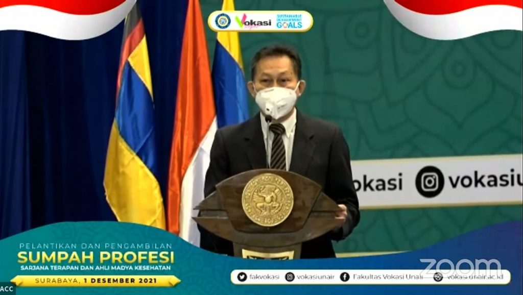 UNAIR NEWS – Sebanyak 252 calon sarjana terapan dan ahli madya kesehatan dari sembilan Program Studi,  Departemen Kesehatan Fakultas Vokasi Universitas Airlangga melakukan prosesi Pelantikan dan Pengambilan Sumpah Profesi pada Rabu (01/12/21). Pengambilan sumpah ini dilakukan secara hybrid di Airlangga Convention Center (ACC) dan melalui Zoom beserta siaran langsung melalui Youtube vokasiunair tv