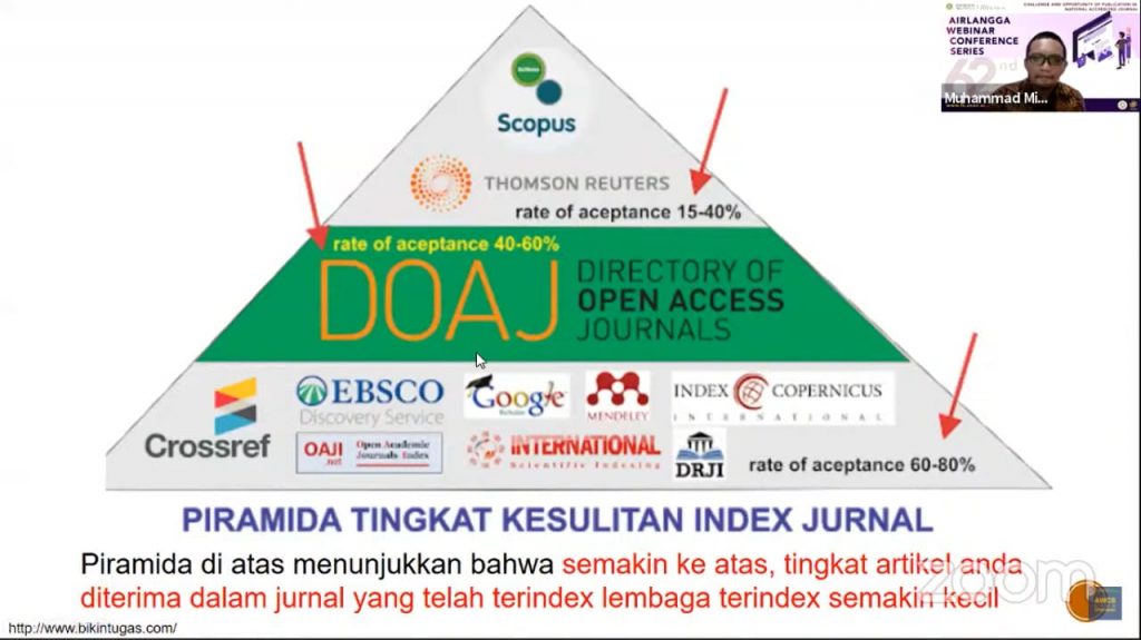According to Doctor Miftah, journals indexed by Googlescholar, EBSCO, DRJI, Index Copernicus and other journal indexing have the highest acceptance rates, about 60% to 80%. In DOAJ indexed journals the estimate for acceptance is around 40% to 60%. Meanwhile, the highest level of difficulty is in the Scopus or Thomson Reuters indexed journals, which are 20% to 40%.