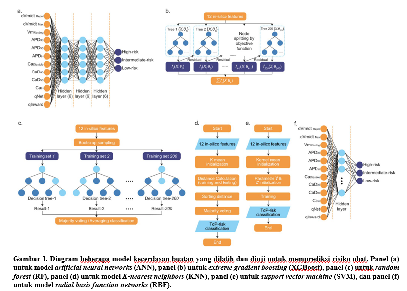 Dalam studi kami, berbagai model kecerdasan buatan diuji untuk memprediksi risiko obat jantung, termasuk ANN, Random Forest (RF), Extreme Gradient Boosting (XGBoost), K-Nearest Neighbors (KNN), Radial Basis Function Networks (RBF), dan Support Vector Machine (SVM). Semua model ini dilatih dan diuji menggunakan 28 obat standar CiPA untuk memprediksi risiko aritmia. Untuk memahami bagaimana masing-masing model bekerja, kami menerapkan metode SHAP untuk menganalisis kontribusi setiap biomarker terhadap performa model. Dari total 14 biomarker yang digunakan, kami melakukan seleksi berdasarkan nilai SHAP untuk menentukan biomarker yang paling berpengaruh terhadap performa prediksi.