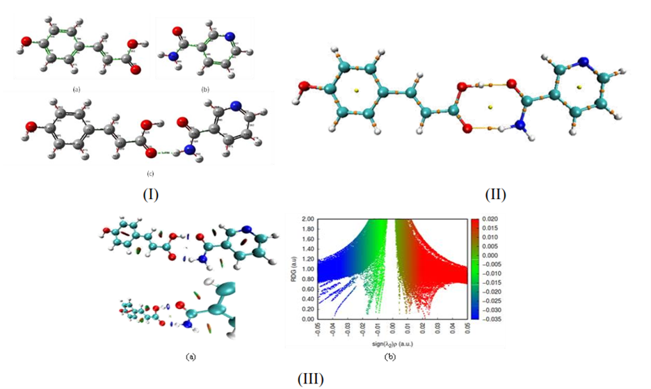 Gambar : (I) Hasil optimasi geometri menggunakan perhitungan DFT/B3LPY: (a) asam p-kumarat, (b) nikotinamida dan (c) kokristal asam p- kumarat-nikotinamida. (II) AIM grafik molekul kokristal asam p-kumarat nikotinamida. Tanda oranye kecil adalah BCP. (III) NCI analisis hasil dari kokristal asam p-kumarat- nikotinamiae: (a) Peta isosurface, (b) plot sebar RDG (biru = ikatan hidrogen; hijau = ikatan van der Walls ; merah = efek sterik).