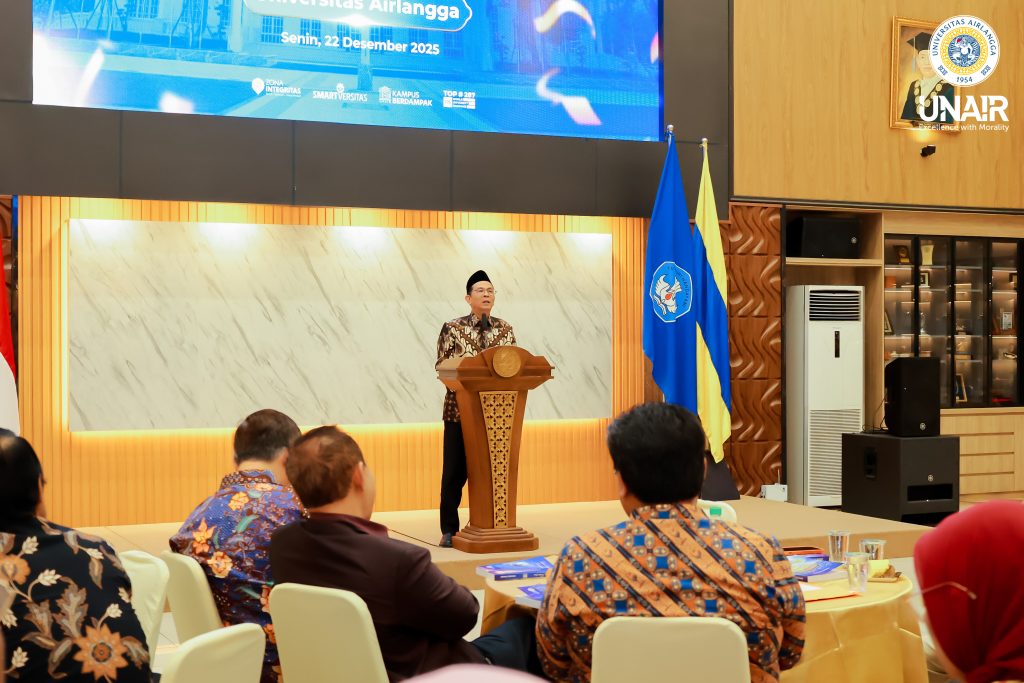 Rektor Universitas Airlangga, Prof Dr Mohammad Madyan SE MSi MFin saat memberi sambutan acara Pelepasan Purnatugas Dosen dan Tenaga Kependidikan, Senin (22/12/2025). (Foto: PHMP UNAIR)