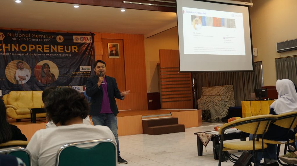 UNAIR NEWS – Semakin majunya teknologi membuat inovasi tentang berbagai hal juga mengalami perkembangan. Salah satunya dalam bidang ekonomi yaitu munculnya bisnis digital. Hal ini dapat menjadi peluang bagi para pengusaha muda untuk mulai merintis usaha (startup) dalam bidang digital. Himpunan Mahasiswa Manajemen Universitas Airlangga (HIMA UNAIR) mengadakan seminar bertajuk Technopreneur sebagai rangkaian kegiatan dari Manajemen Expo (Mexpo) pada Sabtu, (19/10/2019). Acara itu mengundang Cynthia Cecilia selaku Founder dan CEO JOBHUN dan juga Kiki Ahmadi selaku AVP Business Development Amertha sebagai pemateri.