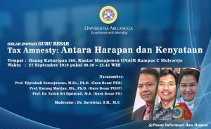Tajuk Gelar Inovasi Guru Besar yang akan dilaksanakan pada Selasa (27/9) bertajuk, “Tax Amnesty: Antara Harapan dan Kenyataan”.