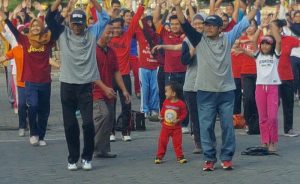 Tepat pukul 06.00, sekitar seribu orang berkumpul di depan halaman gedung rektorat untuk mengikuti senam pagi bersama.