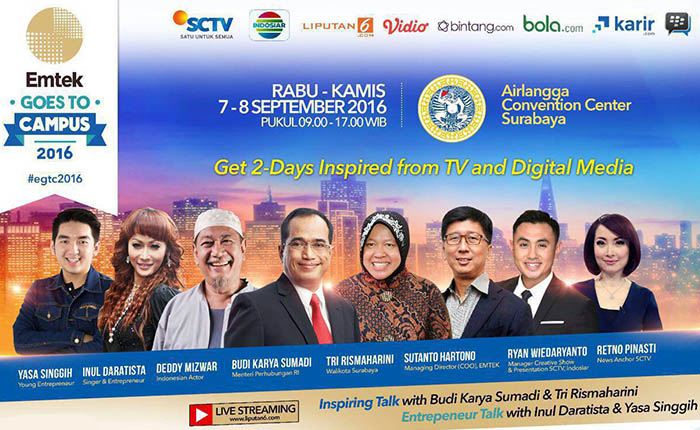Emtek Goes to Campus (EGTC) rencananya akan dilaksanakan di Airlangga Convention Center (ACC), pada tanggal 7-8 September 2016.