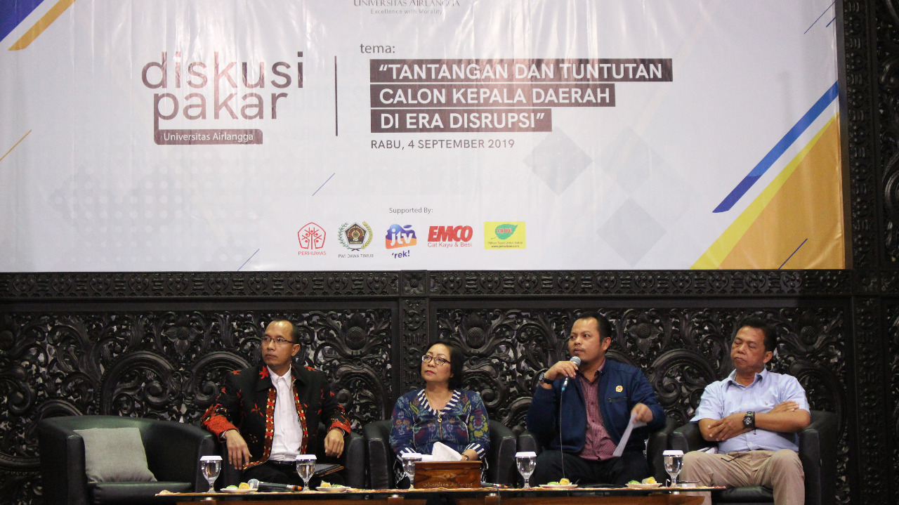 UNAIR NEWS – Menyambut pemilihan kepala daerah tahun 2020, Universitas Airlangga menggelar diskusi pakar bertajuk ‘Tantangan dan Tuntutan Calon Kepala Daerah di Era Disrupsi’. Acara