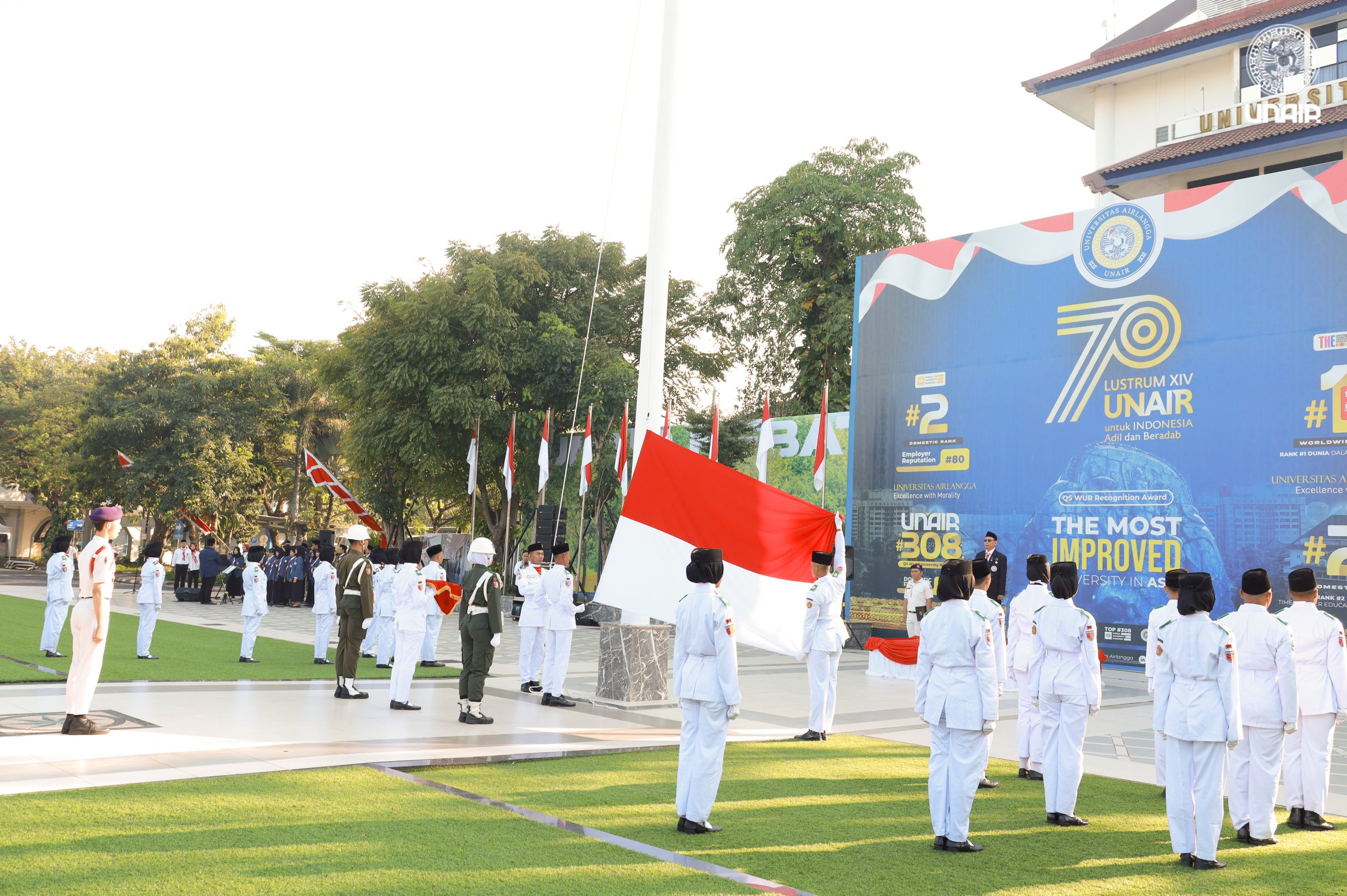 Universitas Airlangga (UNAIR) menggelar upacara dalam rangka menyambut Hari Ulang Tahun (HUT) ke-79 Republik Indonesia (RI) pada Sabtu (17/8/2024). Upacara berlangsung di Halaman Kantor Manajemen