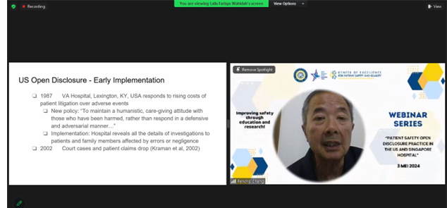 UNAIR NEWS –  PUI-PT Center of Excellence for Patient Safety and Quality (CoE-PSQ) gelar Webinar Patient Safety Open Disclosure Practice in the Singapore and US Hospitals pada Jumat (03/05/2024). Kegiatan itu merupakan serangkaian acara webinar series dalam Fulbright Specialist Program. Acara itu menghadirkan dua narasumber yaitu Dr. Francis Hugh Chang dari Amerika Serikat dan Prof Tan Kok Hian dari Singapura, yang keduanya merupakan ahli di bidang keselamatan dan kualitas pasien.