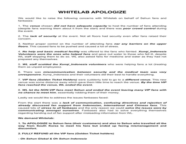 Tweet @OhSehunGlobal yang menjabarkan kesalahan White Lab dan menuntut White Lab untuk meminta maaf