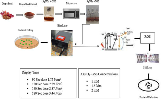 Sifat antibakteri AgNP yang dimediasi GSE kemudian dibandingkan dengan terapi iradiasi laser biru (405 nm) maupun dengan AgNP tunggal terhadap S. aureus dan E. coli. Hasil penelitian menunjukkan bahwa pada konsentrasi 2 mM, AgNP mampu mencapai tingkat fotoinaktivasi bakteri sebesar 87,60% terhadap E. coli dan 91,60% terhadap S. aureus. Bakteri Gram-negatif (E. coli) dan Gram-positif (S. aureus) menunjukkan tingkat resistensi antibakteri yang berbeda, dipengaruhi oleh perbedaan struktur dinding selnya.
