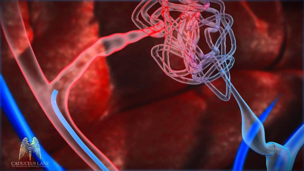 Meskipun umumnya embolisasi saja tidak dapat mengatasi AVM pediatrik secara komplit, laporan sebelumnya telah menyatakan adanya penyembuhan secara radiologis pada 10%-40% kasus. Peluang keberhasilan ini lebih besar pada AVM yang lebih kecil. Namun, risiko komplikasi tetap ada, dilaporkan terjadi pada setinggi 26% kasus. Hal ini berhubungan dengan prosedur embolisasi itu sendiri (perforasi pembuluh darah, hematoma) atau yang berhubungan dengan bahan yang digunakan (emboli arteri pulmonalis yang menyebabkan edema paru, bronkospasme karena penggunaan pelarut dimetil sulfoksida).