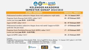 📢 Kalender Akademik Semester Genap 2024/2025 Halo, Mahasiswa Fakultas Ilmu Budaya Universitas Airlangga! Yuk, simak jadwal penting berikut ini: 📅 Jadwal Penting– Konsultasi dengan Dosen