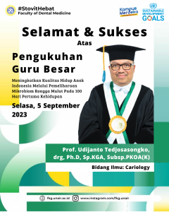 Selamat & Sukses.Atas Suksesnya Pengukuhan Guru Besar Fakultas Kedokteran Gigi Universitas Airlangga (FKG UNAIR). Prof. Udijanto Tedjosasongko, drg, Ph.D, Sp.KGA, Subsp.PKOA(K)Bidang Ilmu: Cariology“Meningkatkan Kualitas Hidup