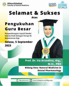 Selamat & Sukses.Atas Suksesnya Pengukuhan Guru Besar Fakultas Kedokteran Gigi Universitas Airlangga (FKG UNAIR). Prof. Dr. Ira Arundina, drg., M.Si., PBOBidang Ilmu: Natural Medicine in