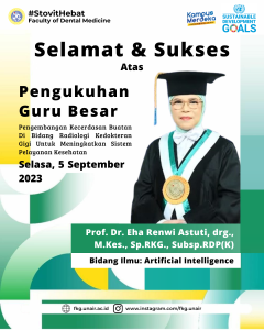 Selamat & Sukses.Atas Suksesnya Pengukuhan Guru Besar Fakultas Kedokteran Gigi Universitas Airlangga (FKG UNAIR). Prof. Dr. Eha Renwi Astuti, drg., M.Kes., Sp.RKG., Subsp.RDP(K)Bidang Ilmu: Artificial