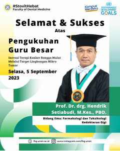 Selamat & Sukses.Atas Suksesnya Pengukuhan Guru Besar Fakultas Kedokteran Gigi Universitas Airlangga (FKG UNAIR). Prof. Dr. drg. Hendrik Setiabudi, M.Kes., PBO.Bidang Ilmu: Farmakologi dan Toksikologi