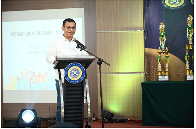 Sekretaris Jenderal MK Berikan Kuliah Umum terkait Pembaharuan Hukum dalam Seminar NLSC FH UNAIR