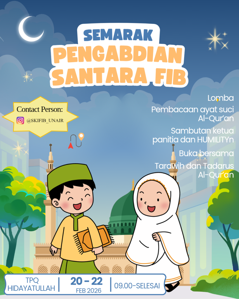 Surabaya, 25 Februari 2026 — Unit Kegiatan Mahasiswa Studi Kerohanian Islam Fakultas Ilmu Budaya (SKI FIB) Universitas Airlangga menyelenggarakan kegiatan SANTARA (Safari Ramadan Nusantara) sebagai bagian dari program tahunan dalam menyemarakkan bulan suci Ramadan 1447 H. Kegiatan yang mengusung tema “Harmoni Ramadan dalam Bingkai Nusantara” ini menghadirkan berbagai rangkaian aktivitas keislaman dan sosial yang dilaksanakan di dua lokasi, yaitu TPQ Hidayatullah Gunung Anyar Surabaya serta lingkungan Fakultas Ilmu Budaya.