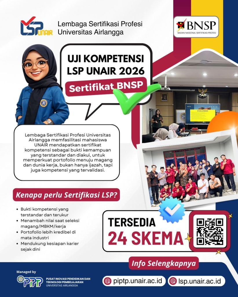 Universitas Airlangga melalui Lembaga Sertifikasi Profesi (LSP) resmi membuka pendaftaran Uji Kompetensi Tahun 2026 bagi mahasiswa aktif UNAIR. Program ini memberikan kesempatan bagi mahasiswa untuk memperoleh Sertifikat Badan Nasional Sertifikasi Profesi (BNSP) yang terstandar dan diakui secara nasional sebagai bagian dari upaya peningkatan kualitas pendidikan tinggi yang inklusif dan relevan dengan dunia kerja, dan sejalan dengan tujuan pendidikan berkualitas.