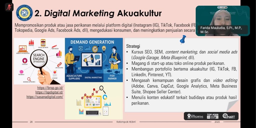 Di era digital, pemasaran produk perikanan juga mengalami transformasi besar. Farida mendorong mahasiswa untuk menjelajahi jalur digital marketing akuakultur. Promosi produk atau jasa perikanan mulai dilakukan di media sosial dan e-commerce. Skill seperti SEO, content marketing, desain grafis, dan video editing menjadi sangat dibutuhkan. Platform seperti Google Garage, Meta Blueprint, Shopee Seller Center, dan LSP Digital disebut sebagai tempat pelatihan yang dapat diakses untuk meningkatkan kompetensi digital mahasiswa.