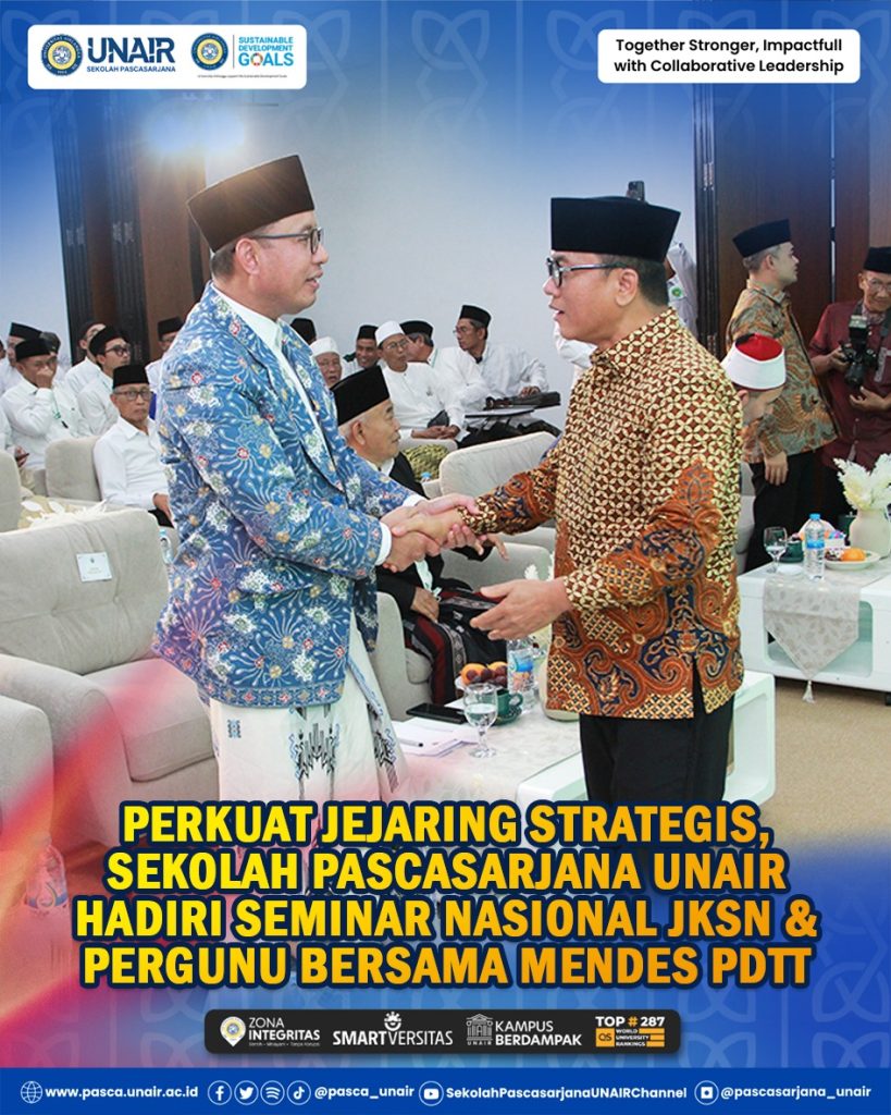 Sekolah Pascasarjana Universitas Airlangga (UNAIR) sebagai “School.Of Collaborative Leadership” terus menunjukkan komitmennya dalam memperkuat jejaring akademis dan praktis dengan berbagai elemen bangsa. Hal ini dibuktikan dengan kehadiran Wakil Direktur 3 Sekolah Pascasarjana UNAIR, Prof. Dr. H. Suparto Wijoyo, SH., M.Hum., dalam acara Seminar Nasional yang diselenggarakan di Kantor Pusat JKSN, Komplek Ponpes Amanatul Ummah, Surabaya, pada Jumat (13/2/2026).