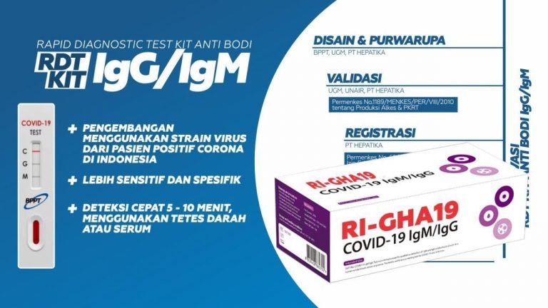 The Covid19 Rapid Test is made in Indonesia, a product of the BPPT Technology Research and Innovation Task Force. GHA is Gajah Mada, Hepatika / Unram, and A is Airlangga. Development of domestic products using viruses from corona positive patients in Indonesia. This product is useful for quickly identifying individuals exposed to Covid-19