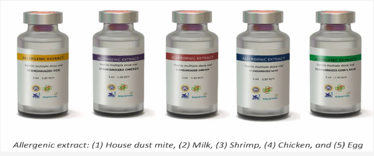 The allergen extract is used as a diagnostic kit and allergen immunotherapy in a primary package, with a vial containing 5 ml of allergen with a w / v ratio of 1:20. This product is useful for the fulfillment of domestic allergen diagnostic and immunotherapy kits. Diagnosis and immunotherapy for 5 (five) allergies house dust mite, milk, eggs, shrimp, chicken