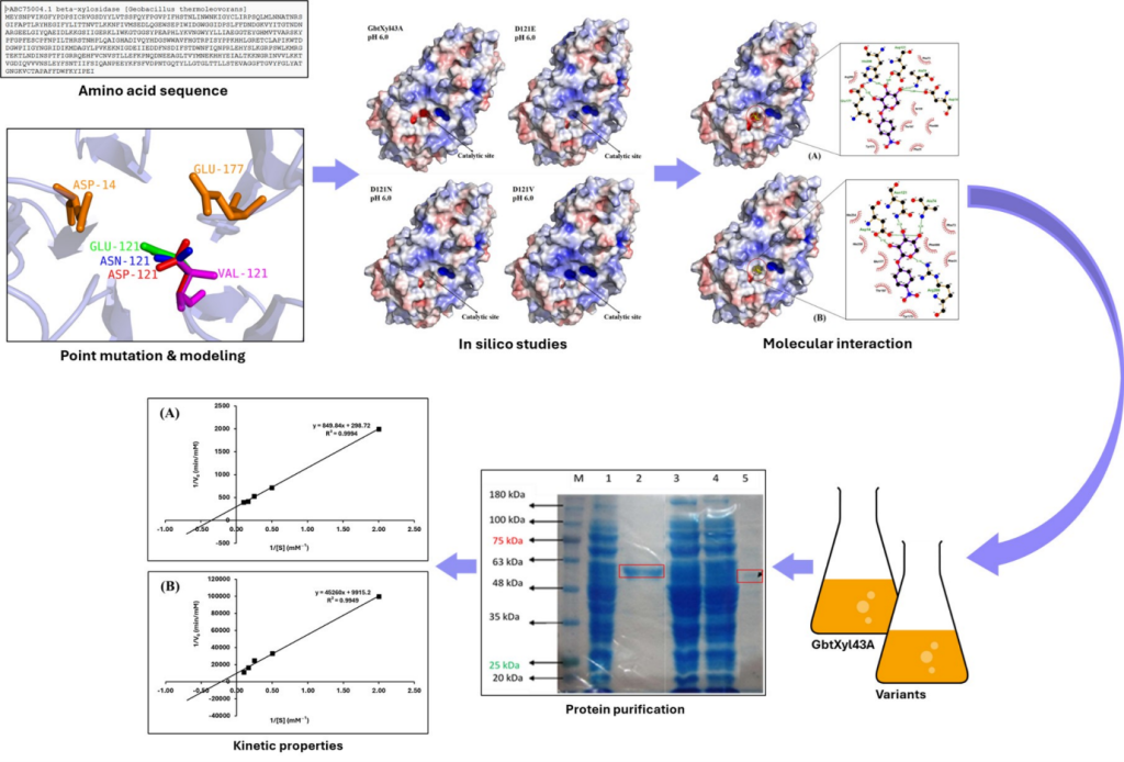 Enzim GbtXyl43A memiliki dua fungsi sekaligus, yaitu β-xilosidase dan α-L-arabinofuranosidase. Aktivitas enzim ini bergantung pada tiga residu penting, yaitu Glu-177, Asp-14, dan Asp-121. Hasil penelitian menunjukkan bahwa Asp-121 berperan besar dalam menjaga kestabilan dan kemampuan katalitik enzim. Ketika Asp-121 dimutasi menjadi asam glutamat (D121E), asparagin (D121N), atau valin (D121V), stabilitas struktural GbtXyl43A menurun secara signifikan. Perubahan tersebut juga memengaruhi distribusi muatan elektrostatik di sekitar situs aktif enzim, sehingga menghambat proses katalisis.