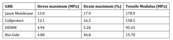 Uji perbedaan kekuatan tarik antara kelompok DDMM dan Membran Jason, menggunakan uji-t sampel independen, menunjukkan adanya perbedaan kekuatan tarik yang signifikan antara kelompok DDMM dan Membran Jason. Berdasarkan data yang diperoleh dari berbagai penelitian, terdapat beberapa GBR yang telah banyak digunakan, beberapa di antaranya adalah Jason Membrane (biomaterial Botiss), Bio-Gide (membran Geistlich®), dan Collprotect (biomaterial Botiss). Untuk mengetahui kemampuan DDMM lebih baik, dilakukan perbandingan pada keseluruhan GBR. Kemampuan kekuatan tarik dari ketiga membran dan kemampuan DDMM akan diuraikan dalam tabel berikut.