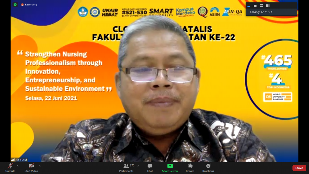 UNAIR NEWS- The 22nd Anniversary (Dies Natalis) commemoration of Universitas Airlangga’s Faculty of Nursing (FKp) started last May, was officially concluded online on Tuesday, June 22, 2021. The closing ceremony was attended by the Dean, Prof. Dr. Ah. Yusuf, S.Kp., M. Kes, along with the faculty’s staff, the professors of FKp UNAIR, the chairman of the alumni association (IKA) FKp, the lecturers, students, and also the invitees.