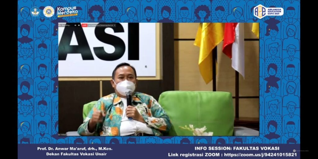 UNAIR NEWS – Fakultas Vokasi Universitas Airlangga (FV UNAIR) menyelenggarakan Info Session pada Gelaran Airlangga Education Expo (AEE) 2021 pada Jumat (19/2/2021). Pada sesi sharing informasi tersebut Dekan FV UNAIR Prof. Dr. Anwar Ma’aruf, drh., M.Kes beserta jajaran Wakil Dekan dan Koordinator Departemen FV UNAIR turut menjadi narasumber utama.