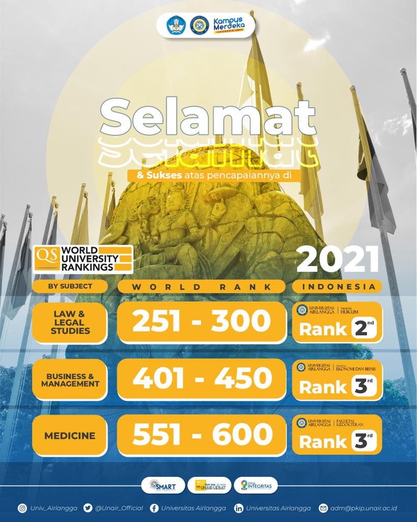 UNAIR NEWS – Universitas Airlangga (UNAIR) has confirmed itself as one of Indonesia’s best universities. This time, its reputation was strengthened by the release of Quacquarelli Symonds World University Rankings (QS WUR) 2021 by Subject: Medicine. Faculty of Medicine (FK) UNAIR is in the top three positions in Indonesia, with global rank #551-600.