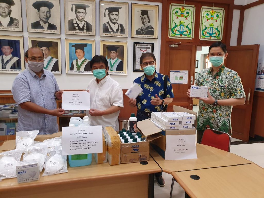 Bertempat di FKG UNAIR pada Selasa (28/4/2020), sebanyak 500 masker N95 diserahkan langsung oleh Dekan FKGUA Dr. R. Darmawan Setijanto., drg., M.Kes dan diterima oleh Direktur RSGMUA, Prof. RM. Coen Pramono D., drg., SU., Sp. BM(K). Bersama itu pula diserahkan sumbangan dari Ikatan Alumni Universitas Airlangga komisariat Kedokteran Gigi berupa 120 masker KN95, 232 liter hand sanitizer cair, 50 liter hand sanitizer gel, dan 1 alat extra oral suction.