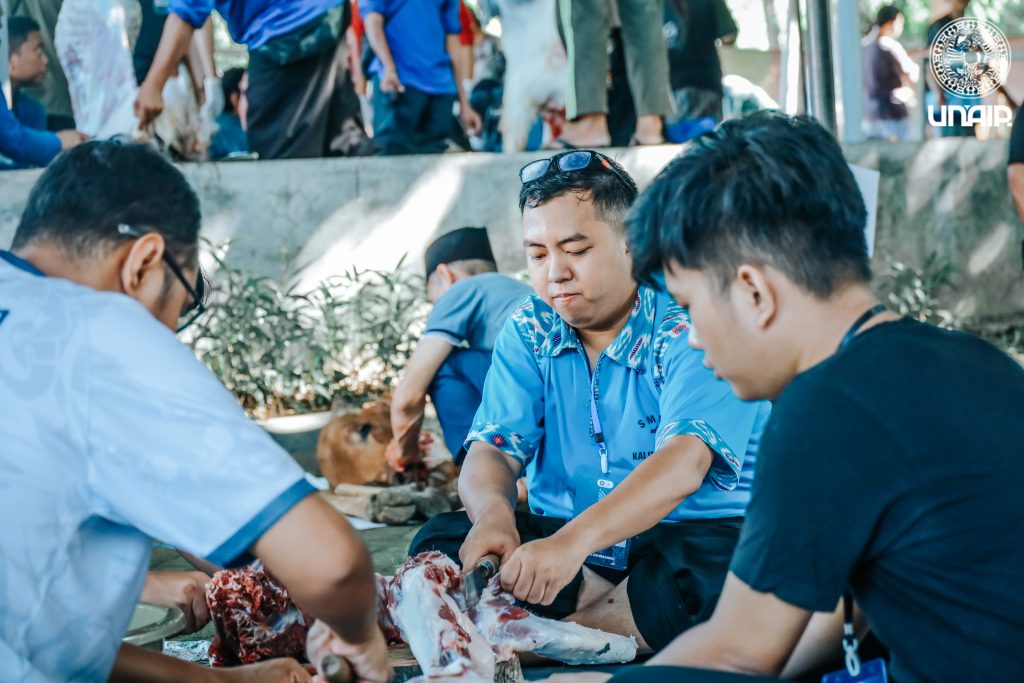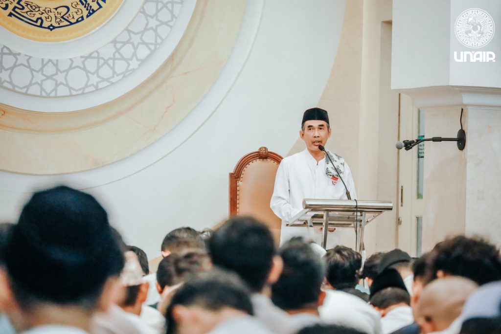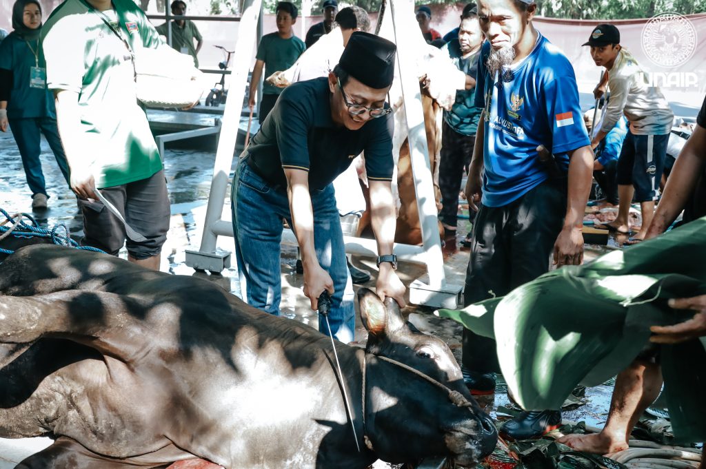 Universitas Airlangga menyelenggarakan Sholat Idul Adha 1446 H pada Jum’at (6/6/2025) di Masjid Ulul Azmi, Kampus MERR-C. Kegiatan dimulai pukul 05.30 WIB dan dihadiri oleh sivitas akademika UNAIR serta masyarakat sekitar. Prof Abdul Kadir Riyadi M.Soc.Sc., Ph.D., Dekan Fakultas Ushuluddin dan Filsafat UIN Sunan Ampel Surabaya, bertindak sebagai khatib sekaligus imam. Kegiatan dilanjutkan dengan proses penyembelihan hewan qurban yang dihadiri oleh Wakil Rektor, Sekretaris UNAIR, Direktur DLKKL UNAIR serta panitia qurban yang bertugas. Untuk tahun ini panitia menerima 12 ekor sapi dan 11 ekor kambing dari para jama’ah.