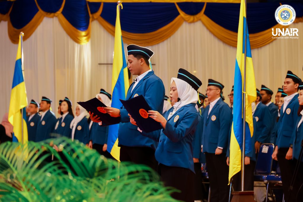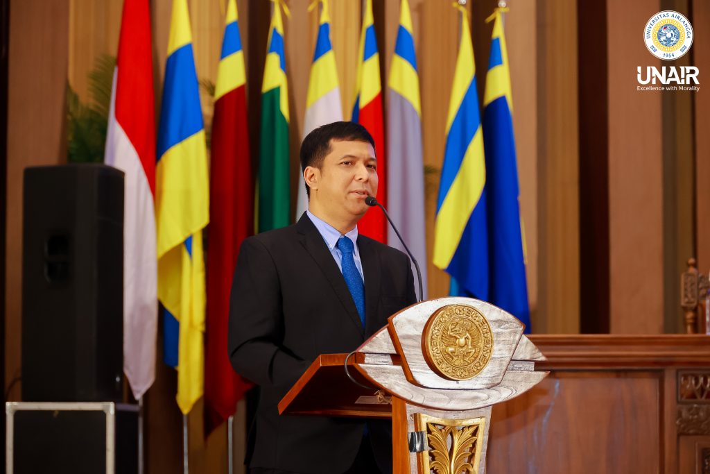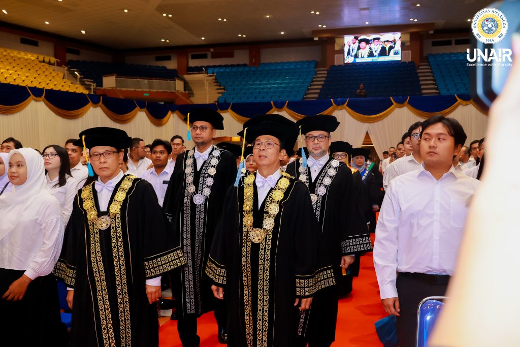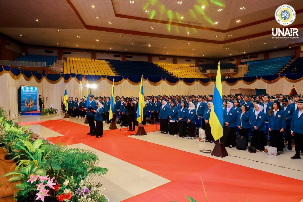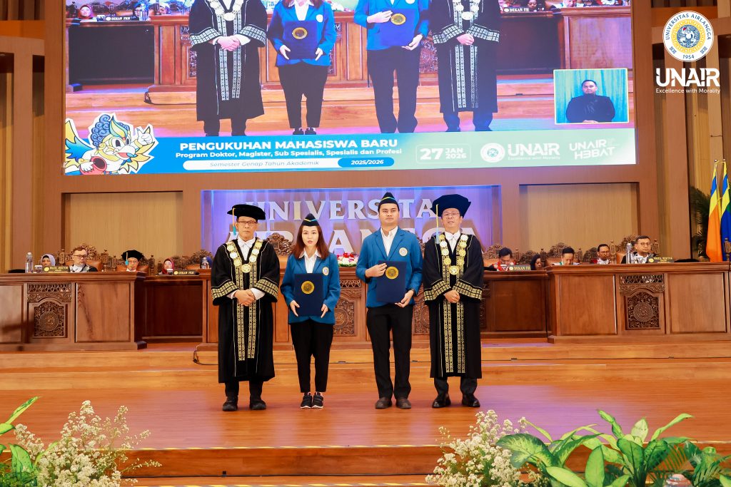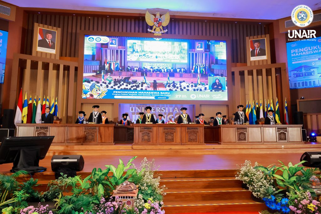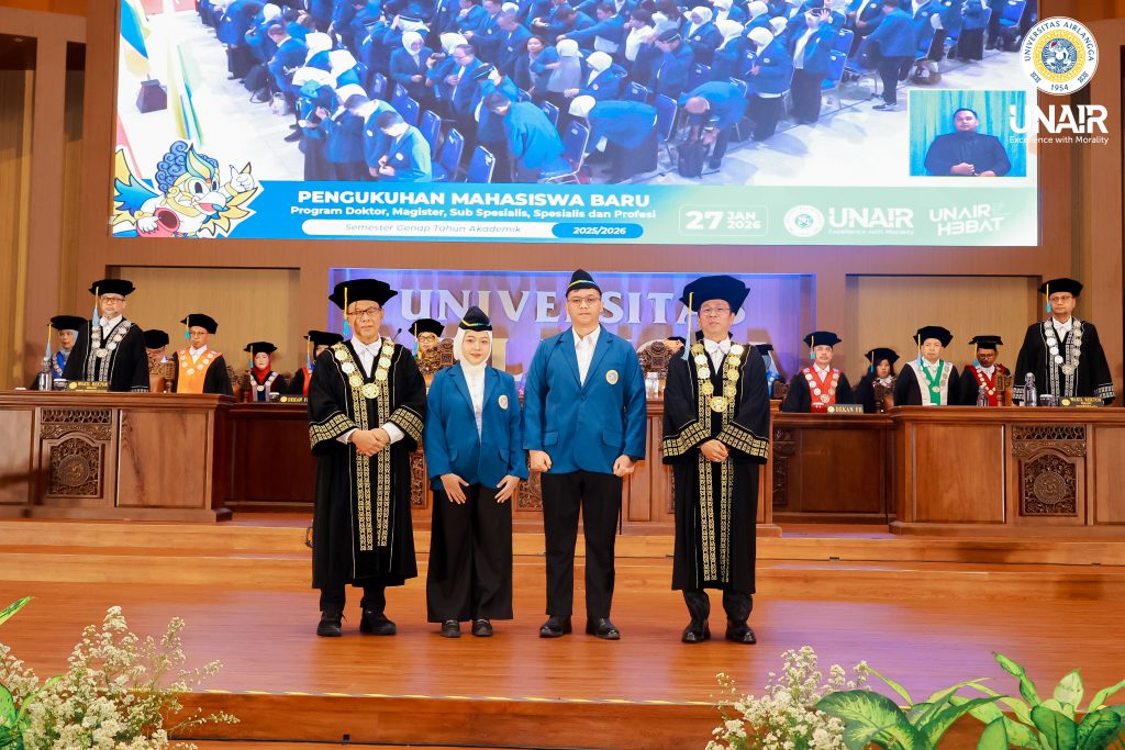 Universitas Airlangga (UNAIR) kembali gelar Pengukuhan Penerimaan Mahasiswa Baru Program Pendidikan Doktor, Magister, Subspesialis, Spesialis, dan Profesi Semester Genap Tahun Akademik 2025/2026. Pengukuhan tersebut berlangsung pada Selasa (27/1/2026) di Gedung Airlangga Convention Center (ACC). Sejumlah 936 mahasiswa baru hadir dan mengikuti dengan khidmat prosesi pengukuhan tersebut yang dipimpin oleh rektor dan jajaran pimpinan UNAIR. Rektor UNAIR Prof Dr Muhammad Madyan SE MSi MFin dalam sambutannya menuturkan bahwa keputusan para mahasiswa melanjutkan pendidikan di UNAIR merupakan langkah penting yang mencerminkan komitmen kuat terhadap pengembangan diri, keilmuan, dan kontribusi nyata bagi masyarakat.
