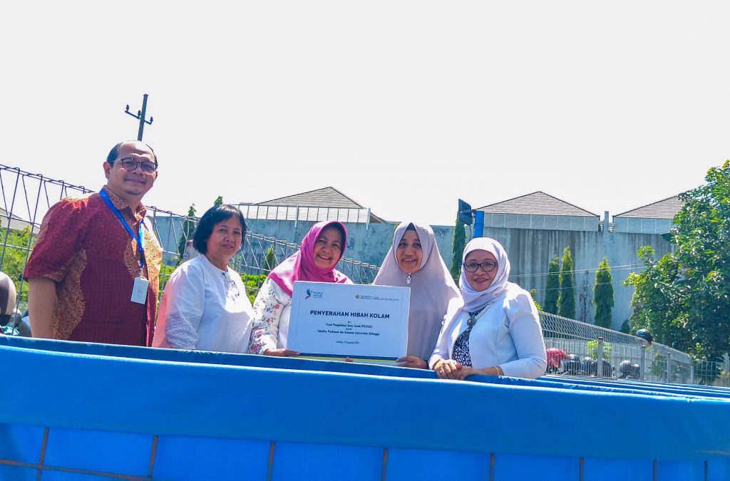 UNAIR NEWS – Pusat Pengelolaan Dana Sosial (PUSPAS) Universitas Airlangga menyerahkan dana hibah kolam untuk Fakultas Perikanan dan Kelautan (FPK) Universitas Airlangga pada Jumat (28/09/2019). Seremoni hibah kolam berlangsung di FPK UNAIR, tepatnya di depan kolam yang terletak di halaman parkir sepeda motor.