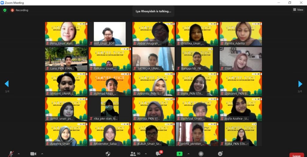 Acara dimulai dengan sambutan dari ketua KMP PKN STAN dan sambutan Ketua HIMA D3 Perpajakan UNAIR Kegiatan ini diadakan untuk menjelaskan tentang program kerja oleh masing-masing pihak yang diwakilkan oleh Ketua HIMA D3 Perpajakan dan KMP PKN STAN. Pada kegiatan kali ini juga terdapat pembahasan mengenai isu-isu pajak terkini, perwakilan dari HIMA D3 Perpajakan dan KMP PKN STAN menyampaikan opininya tentang perubahan aturan pengenaan sanksi administrasi pajak pada UU KUP no 36 tahun 2008 dan UU CIPTAKER tahun 2020.