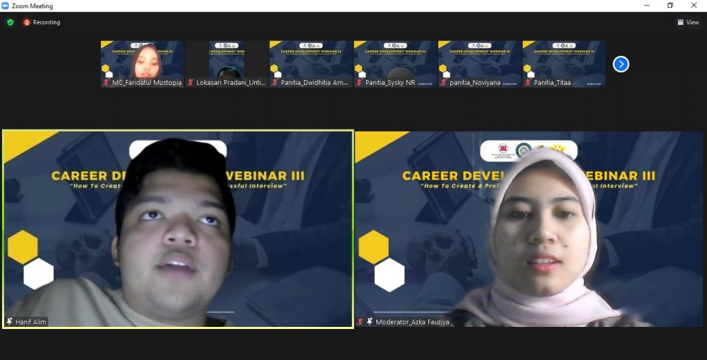UNAIR NEWS – Persaingan seleksi masuk kerja yang semakin meningkat menjadi tantangan berat bagi setiap orang terutama mahasiswa dengan status fresh graduate. Mengenai hal tersebut, HMA UNAIR Banyuwangi gelar Webinar Career Development dengan tema How to Create a Professional CV and Successful Interview. Program itu merupakan bentuk pengenalan dunia kerja serta persiapan untuk merintis karir selepas masa studi.