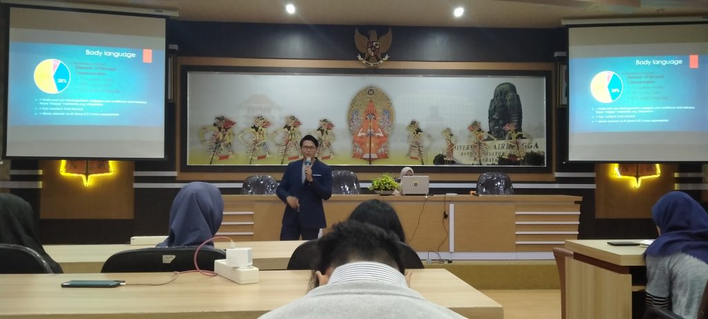 Furthermore, in the activity held at UNAIR Campus B Parlinah Hall, Briansyah mentioned that there were three things that always became the focus of the audience to the people who spoke. The three of them, 55 percent of the audience will pay attention to the speaker’s body language, 33 percent focus on the speaker’s voice and tone, and the remaining 7 percent listen to the contents of the sentence spoken.