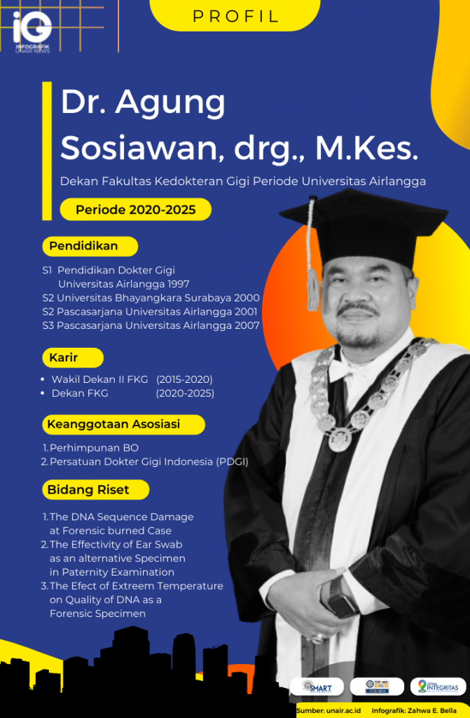 UNAIR NEWS – Mantan wakil dekan II Fakultas Kedokteran Gigi Universitas Airlangga (FKG UNAIR) Dr. Agung Sosiawan, drg., M.Kes. saat ini telah naik pangkat menjadi Dekan FKG UNAIR periode 2020-2025. Beliau merupakan salah satu anggota dalam asosiasi Perhimpunan Boedi Oetomo dan Persatuan Dokter Gigi Indonesia (PDGI).