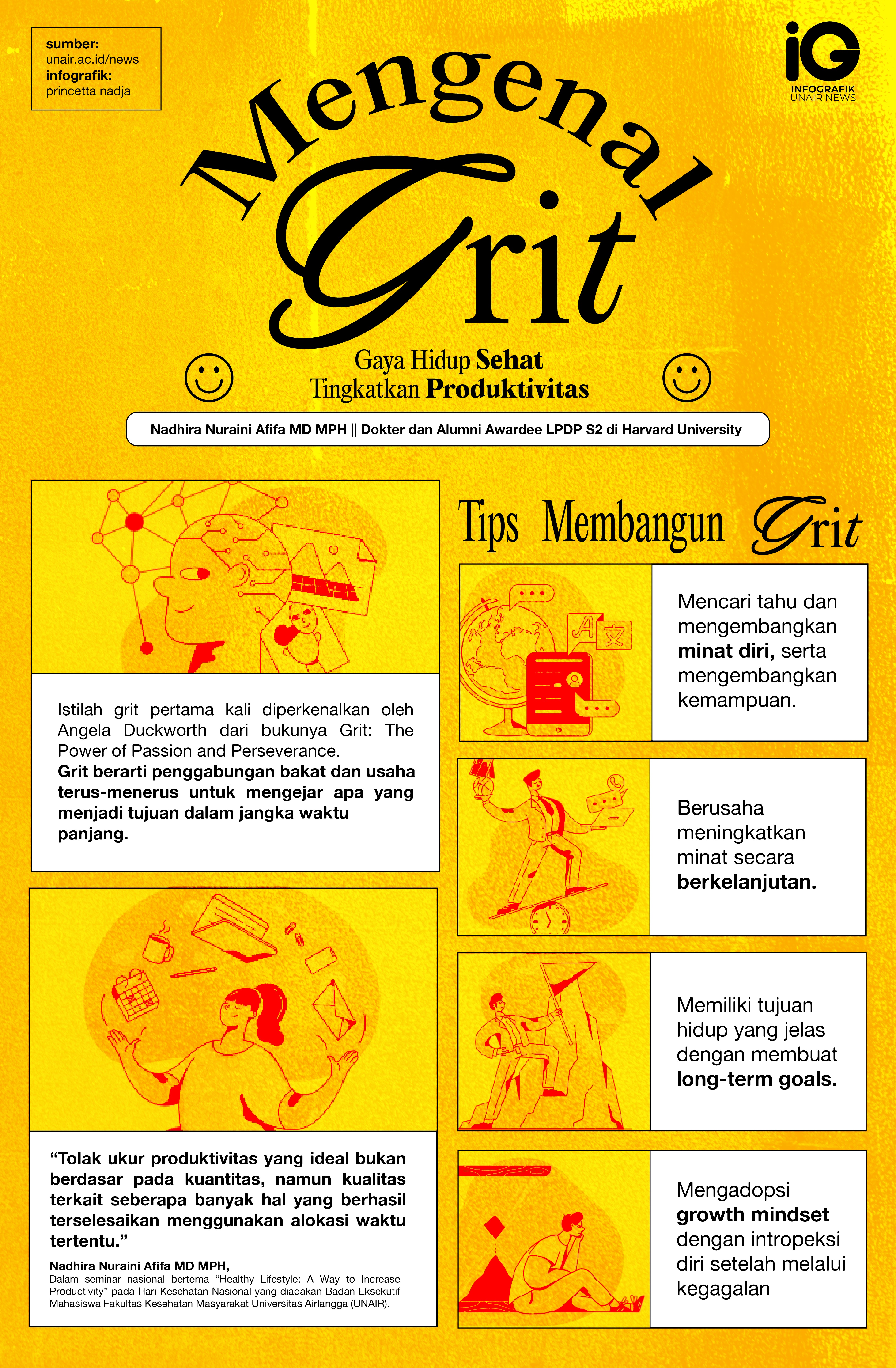 Salah satu sosok inspiratif tanah air yang menjadi narasumber, Nadhira Nuraini Afifa MD MPH merupakan seorang dokter dan alumni awardee LPDP S2 di Harvard University yang telah lulus tahun 2020 lalu. Pada kesempatan ini, ia berbagi tips mengenai grit sebagai gaya hidup sehat.