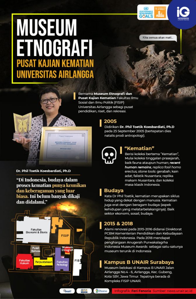 UNAIR NEWS – Museum Etnografi dan Pusat Kajian Kematian Fakultas Ilmu Sosial dan Ilmu Politik (FISIP) Universitas Airlangga didirikan oleh Dr. Phil Toetik Koesbardiati, Ph.D., pada 25 September 2005. Museum ini didirikan sebagai pusat edukasi atau pendidikan, riset, serta sebagai media rekreasi. Museum ini mengangkat tema “Kematian”.