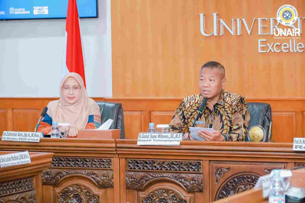 UNAIR NEWS – Dalam rangka meningkatkan kualitas layanan kesehatan masyarakat sekaligus wujud implementasi Tri Dharma Perguruan Tinggi, Universitas Airlangga (UNAIR) jalin kerja sama dengan RSUD Dr Iskak Tulungagung. Jalinan kerja sama tersebut ditandai dengan penandatanganan Perjanjian Kerja Sama (PKS) yang berlangsung pada Selasa (25/11/2025) di Ruang Sidang Pleno Balai RUA, lantai 4 Kantor Manajemen, Kampus MERR-C UNAIR.