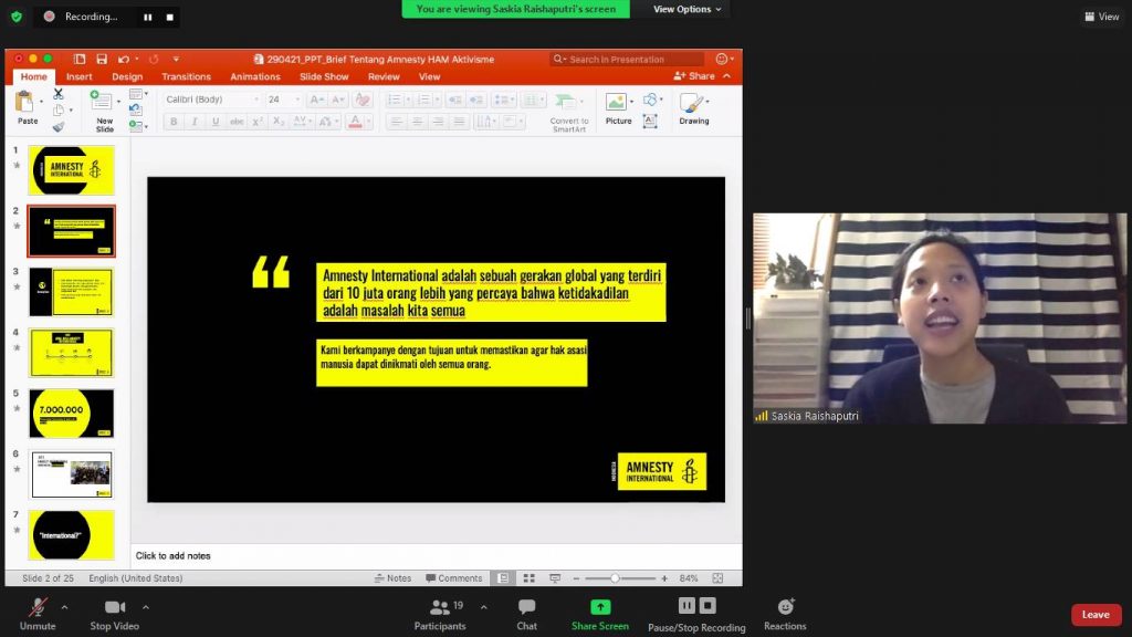 UNAIR NEWS – Kementerian Hubungan Luar BEM UNAIR pada Kamis siang (6/5/2021) menggelar program yakni Non-Governmental Organization (NGO) Visit. NGO yang menjadi pilihan untuk digelarnya anjangsana edukasi tersebut adalah Amnesty International Indonesia (AII). AII sendiri merupakan organisasi yang berfokus pada kampanye terkait isu-isu hak asasi manusia, sebuah cabang nasional dari gerakan global yakni Amnesty International.