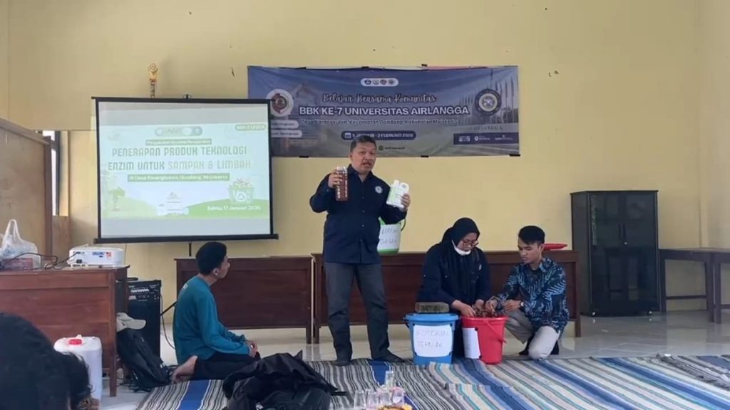 UNAIR NEWS – Mahasiswa KKN-BBK 7 Universitas Airlangga Desa Karangkuten Gondang Mojokerto melaksanakan Program Kerja Bidang Lingkungan bertema “BIO ENZI!: Aplikasi Teknologi Enzim untuk Penanganan Limbah dan Polusi Bau pada Ternak.” Kegiatan ini berlangsung di Desa Karangkuten, Kecamatan Gondang, Kabupaten Mojokerto, dengan lokasi pelaksanaan di Balai Dusun Tumbuk pada Sabtu, 17 Januari 2026. Program tersebut menjadi wujud pengabdian mahasiswa kepada masyarakat dalam memberikan solusi inovatif terhadap persoalan limbah dan bau dari usaha peternakan, sekaligus mendorong pengelolaan lingkungan desa yang lebih sehat.