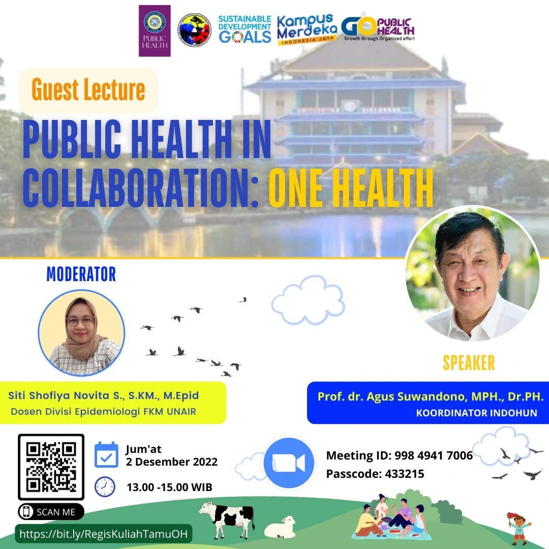 UNAIR NEWS – Tingkatkan wawasan dan pengetahuan tentang pentingnya konsep one health pada mahasiswa. Fakultas Kesehatan Masyarakat (FKM) Universitas Airlangga (UNAIR) menyelenggarakan kuliah tamu dengan tema Public Health in Collaboration: One Health pada Jumat (2/12/2022) secara daring melalui platform Zoom Meeting.