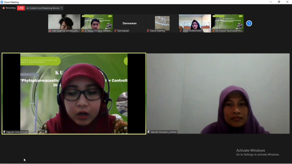 Mengawali pemaparannya, Waode -sapaan akrabnya- menjelaskan tentang immunostimulant dan beberapa bahan yang bisa digunakan sebagai zat immunostimulant salah satunya tanaman obat. Ia mengungkapkan imunostimulan merupakan pendekatan yang banyak dilakukan dalam mengatasi permasalahan penyakit. Dengan pemberian zat immunostimulant dapat secara alami menekan infeksi mikroba patogen melalui aktivitas imun kultivan.