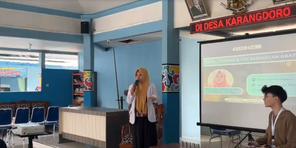 Mahasiswa KKN BBK 7 Universitas Airlangga Kelompok Karangdoro 2 menginisiasi program Kenal Ternak (Kesehatan dan Nalar Penyakit Ternak) sebagai solusi edukasi kesehatan hewan yang berkelanjutan guna menjawab kebutuhan krusial masyarakat di Desa Karangdoro. Melalui pembekalan nalar medis yang memadai bagi para pemilik ternak, risiko mortalitas hewan akibat keterlambatan penanganan klinis diharapkan dapat diminimalisir secara signifikan pada skala pedesaan. Fokus utama dalam agenda ini diarahkan pada mitigasi Penyakit Mulut dan Kuku (PMK) yang disampaikan secara komprehensif oleh pakar kesehatan hewan, Tridiganita Intan Solikhah, drh., M.Si, selaku Dosen Fakultas Ilmu Kesehatan, Kedokteran dan Ilmu Alam Universitas Airlangga.